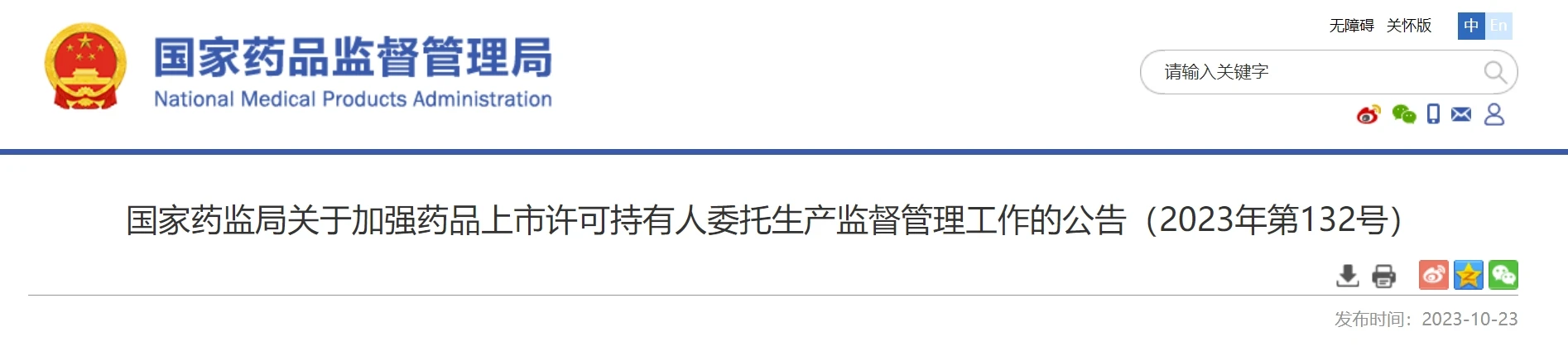 国家药监局关于加强药品上市许可持有人委托生产监督管理工作的公告(2023年132号)