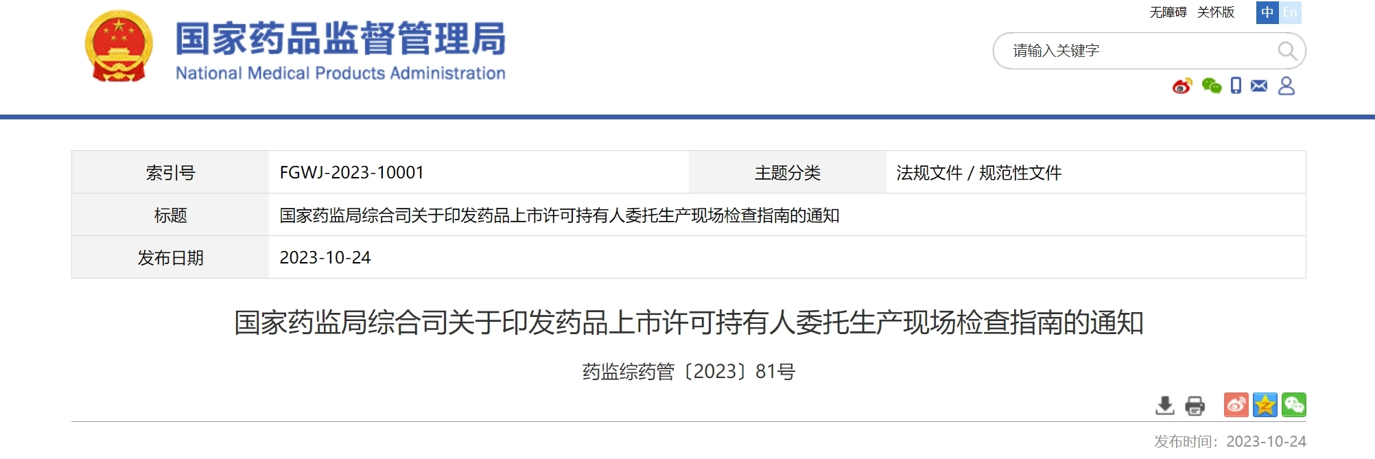 #中仁康博 热点资讯#继近日发布《国家药监局关于加强药品上市许可持有人委托生产监督管理工作的公告(2023年第132号)》之后,10月24日,国家药监局发布《关于印发药品上市许可持有人委托生产现场检查指南的通知》,该《通知》自10月17日起实施。