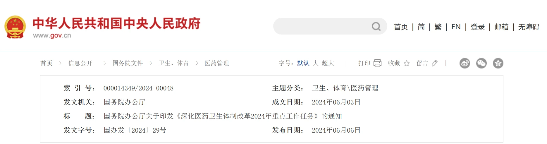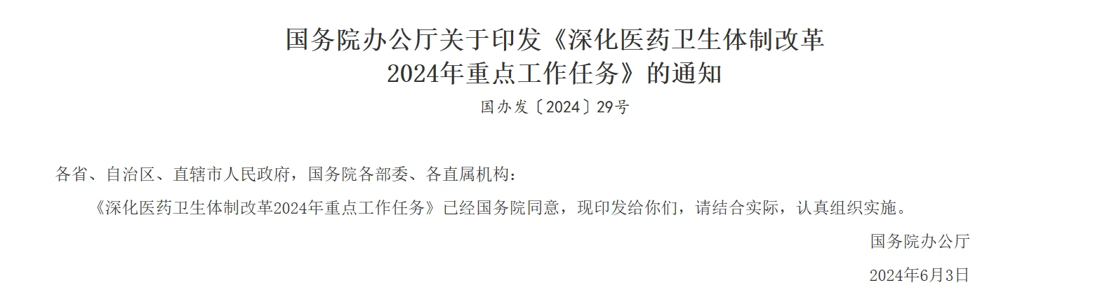 6月6日,国务院办公厅印发《深化医药卫生体制改革2024年重点工作任务》(下文简称《任务》)。